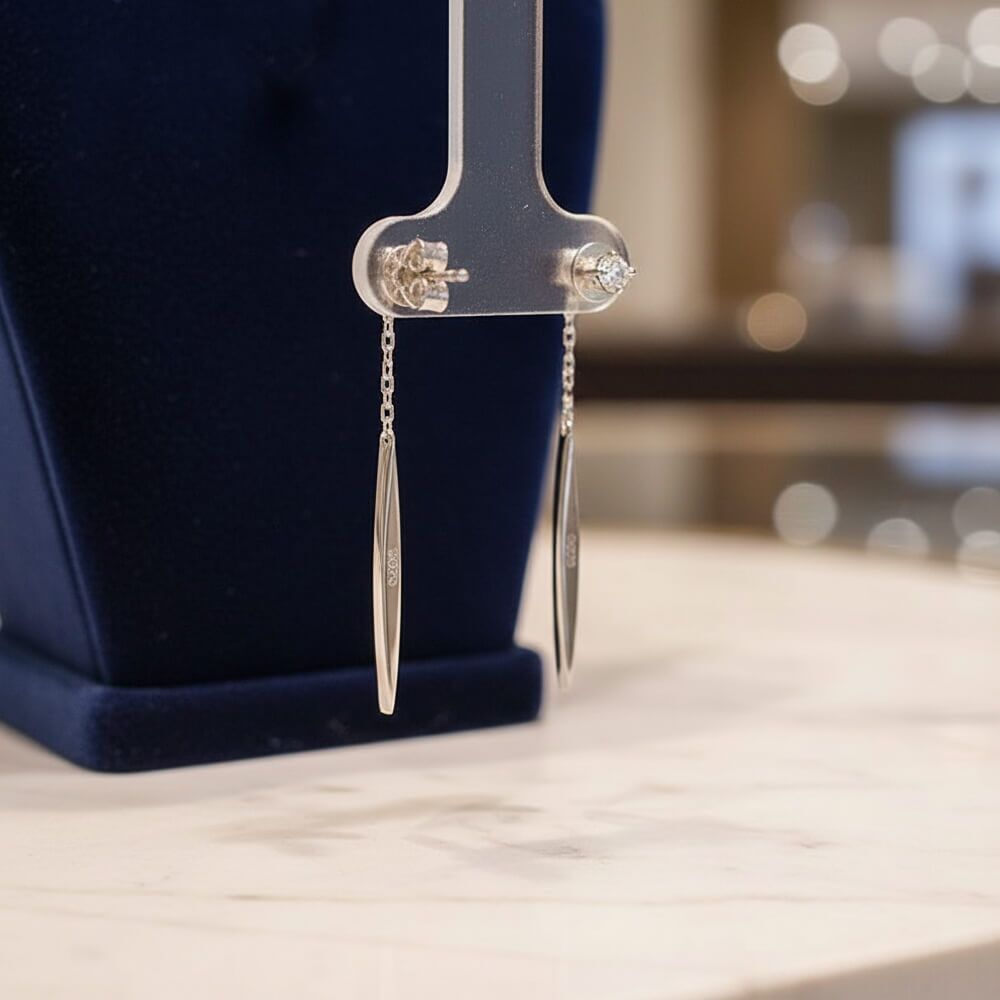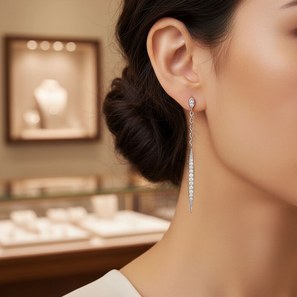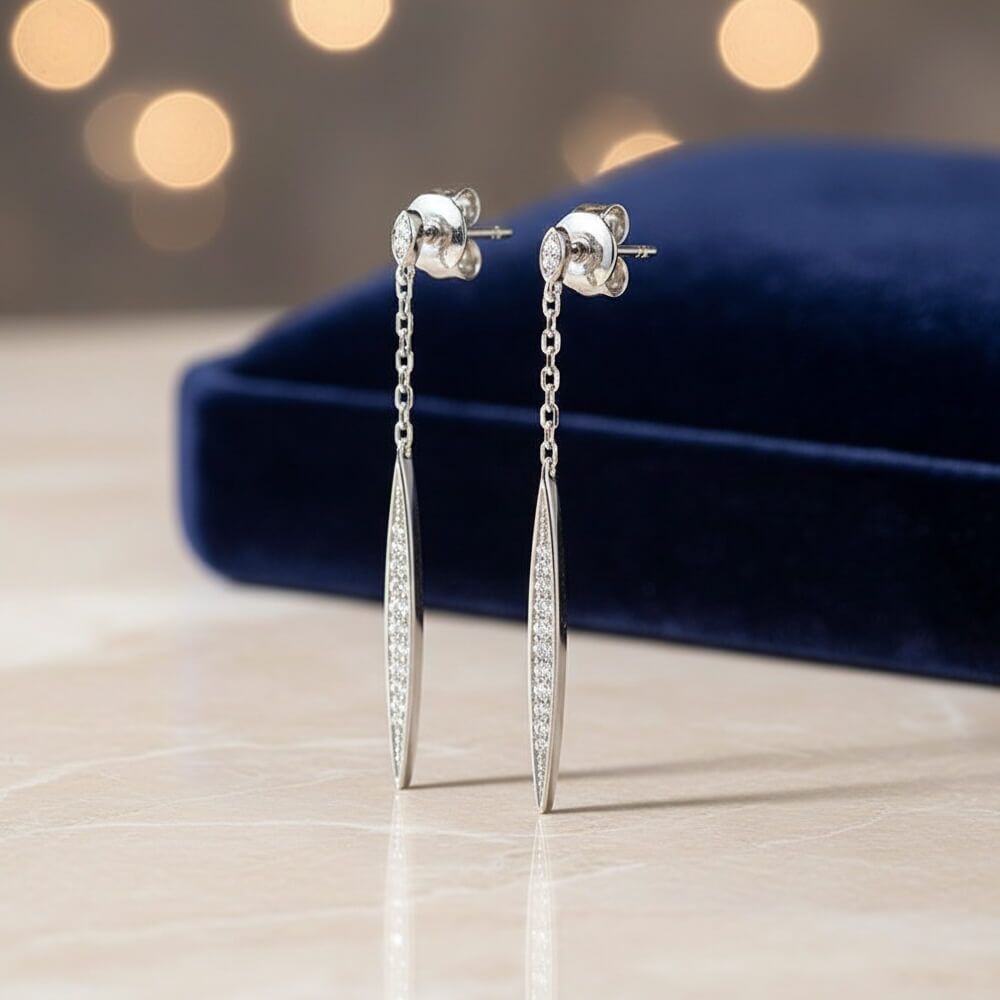 Each earring features a stunning Moissanite stone, known for its brilliant sparkle and diamond-like appearance. These gems catch the light in a mesmerizing dance, offering a dazzling display of elegance and charm.